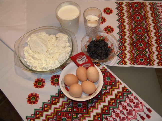 Сперва подготовим продукты. Потом в творог добавляем яйца и все перемешиваем.