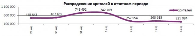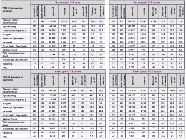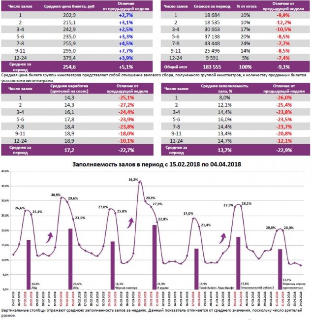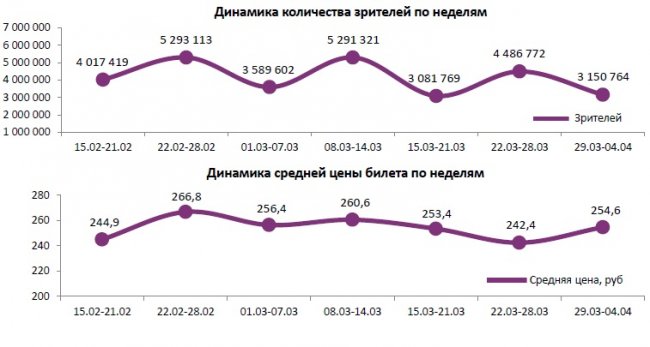 Как показывает индустриальная статистика с 29 марта по 4 апреля (неделя №13), посещаемость российских кинотеатров снизилась до 3,2 млн зрителей, что соответствует уровню 15-21 марта. Российский фильм «Я худею» преодолел рубеж в 600 млн рублей, а «Лед» - 1,45 млрд. «Каникулы президента» стартовали с 28 млн рублей. По наработке на сеанс лучшие результаты у лидера проката – фильма Стивена Спилберга «Первому игроку приготовиться».