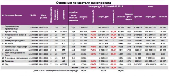 Отчет Фонда кино за 13 неделю 2018 года: «Первому игроку приготовиться» ожидаемо лидирует