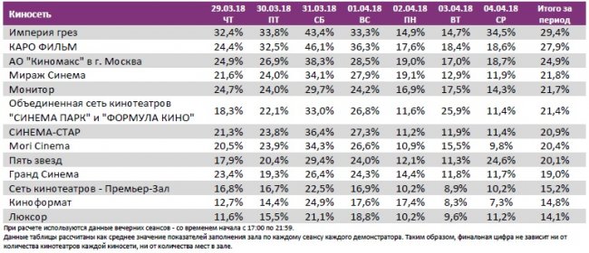 Заполняемость кинозалов крупнейших киносетей на сеансах фильма-лидера недели