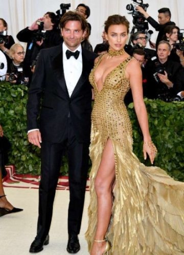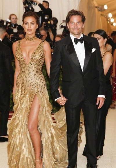 32-летняя россиянка Ирина Шейк пришла в золотом платье от Versace, расшитом пайетками, с глубоким декольте и высоким разрезом. Платье, эффектно подчеркивающее фигуру модели, дополнял чокер на шее, а также золотые босоножки на высоких каблуках.