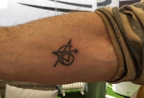 Татуировка представляет собой некое изображение логотипа Мстителей, который дополняется цифрой шесть. Последнее символично, ведь в первой части фильма было всего шесть персонажей.