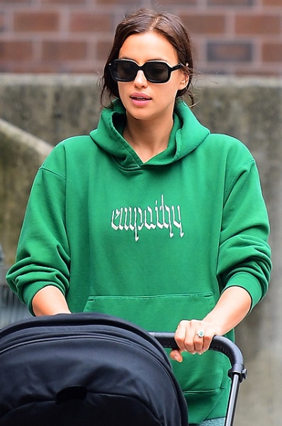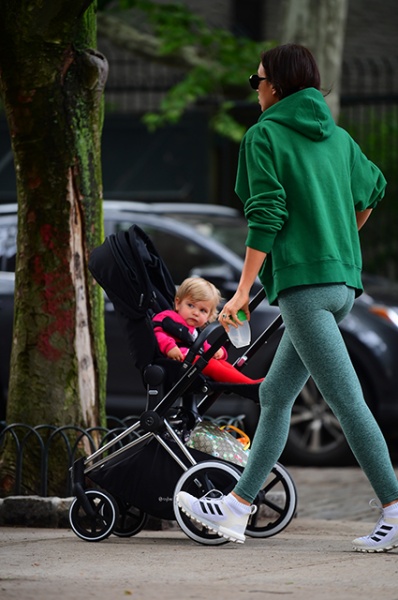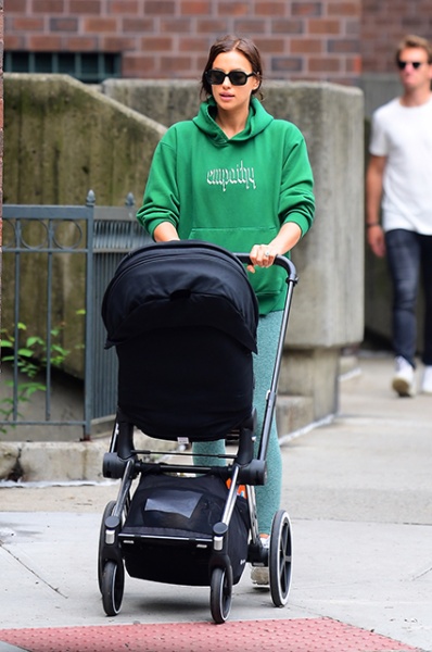 Фотографы застали Ирину на улице, когда она везла Лею в коляске в парк. Шейк отдыхала от макияжа и тщательно подготовленных образов, поэтому выбрала удобную зеленую толстовку, серые легинсы и белые кроссовки.
