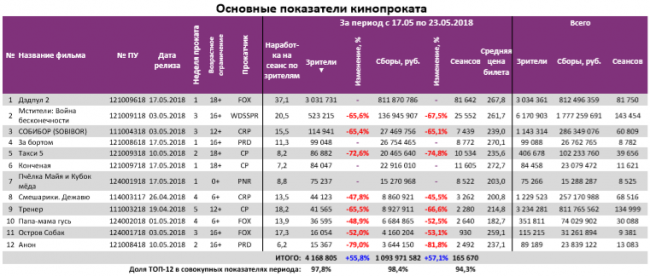 Как показывает индустриальная статистика с 17 по 23 мая (неделя №20), свыше 70% проданных билетов пришлось на долю «Дэдпула 2». При этом роспись новинки составила 47%. За первую неделю кинокомикс привлек в кинотеатры больше 3 млн зрителей, сборы превысили 800 млн рублей. Фантастический экшн «Мстители. Война бесконечности» за три недели заработал 1,78 млрд рублей. 65% посещаемости потерял «Собибор», увеличив общие сборы до 286 млн рублей. Высокую наработку на сеанс продемонстрировал документальный фильм «Караваджо: Душа и кровь».