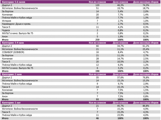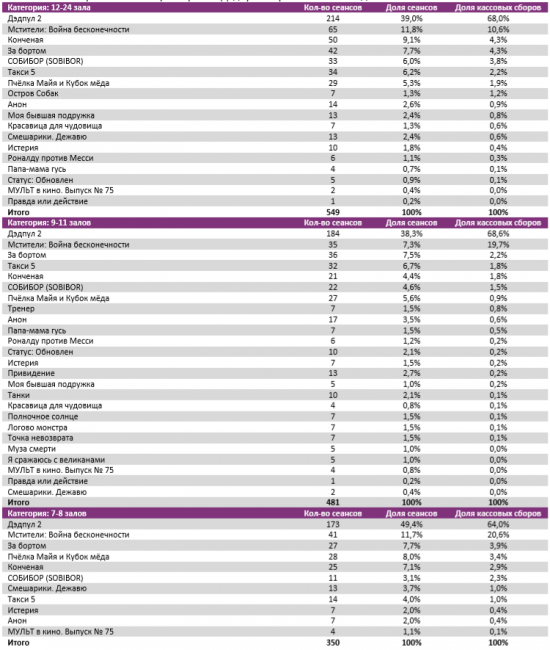 «Мстители» на третьей неделе увеличили количество однозальных кинотеатров с 493 до 511 кинотеатров. У «Дэдпула 2» на старте было 397 кинотеатров.