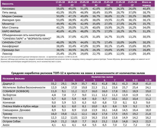 Заполняемость кинозалов крупнейших киносетей на сеансах фильма-лидера недели Фильм-лидер недели: «Дэдпул 2». «Киномакс» - единственная сеть, показавшая на «Дэдпуле 2» среднюю заполняемость выше 40%.