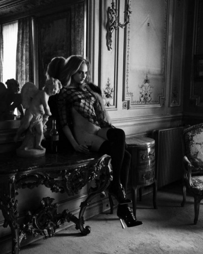 Кара Делевинь снялась для камер фотографов Питера Линдберга и Фабьена Барона. В их объективах Кара позирует совсем без белья. На черно-белых кадрах Делевинь предстала в верхней одежде, под которой нет ничего, кроме чулок.