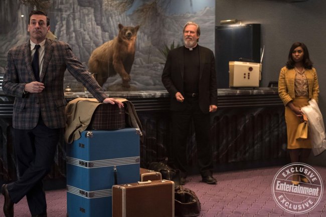 Несколько свежих кадров из мистического триллера «Ничего хорошего в отеле “Эль Рояль”» с Крисом Хемсвортом, Дакотой Джонсон, Джоном Хэммом, Джеффом Бриджесом и Синтией Эриво. Постановкой ленты занимался Дрю Годдард («Хижина в лесу»), он же работал над сценарием и выступил продюсером.