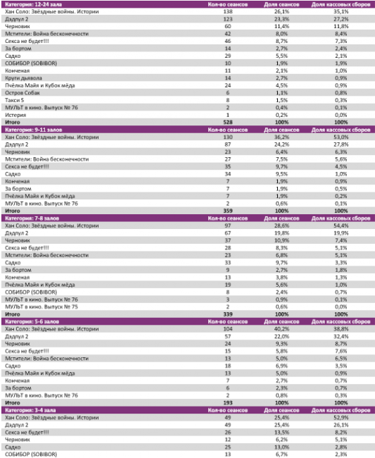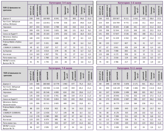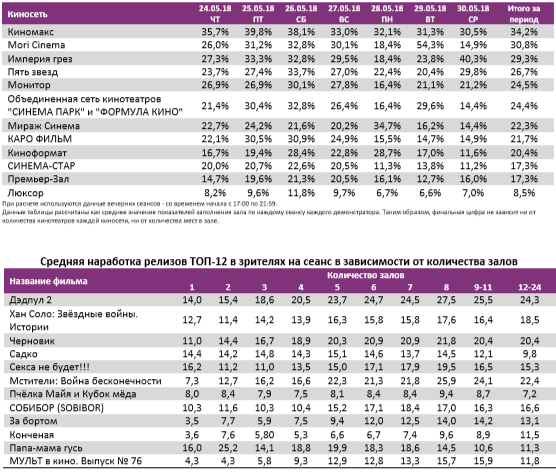 Репертуарное планирование кинотеатров с наибольшей выручкой за период «Дэдпул 2» сохранил лидерство в двух лучших кинотеатрах страны с одним и двумя залами. В пяти лучших кинотеатрах с 3+ залами лидером стала новинка «Хан Соло: Звёздные войны. Истории».