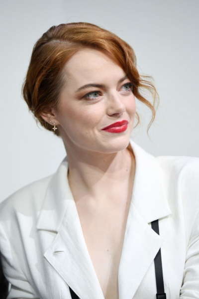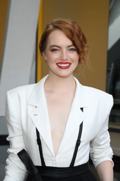 Для выхода на красную дорожку Стоун выбрала необычный черно-белый костюм в ретро-стиле от Louis Vuitton. Верх наряда состоял из белого укороченного пиджака с плечами и глубоким декольте, а низ - черные брюки-бананы. Завершал образ ремень на талии с логотипом Louis Vuitton. А с помощью красной помады и элегантной укладки актриса стала похожа на настоящую француженку.