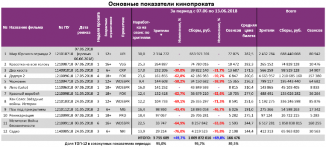 Как показывает индустриальная статистика с 7 по 13 июня (неделя №23), благодаря выходу «Мира Юрского периода 2» посещаемость российских кинотеатров возросла до 4 млн зрителей. На долю новинки пришлось 59% проданных билетов при доле сеансов в 41%. За стартовую праздничную неделю «Мир Юрского периода 2» посмотрело 2,43 млн зрителей. Анимационные российские фильмы «Два хвоста» и «Садко» после двух и трех недель проката заработали 99 млн и 66 млн рублей соответственно. «Лето» Кирилла Серебренникова за семь дней проката посмотрело 144 тыс. зрителей.