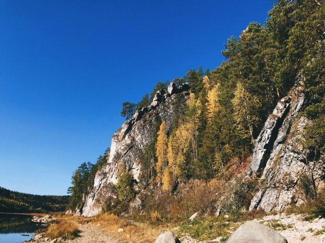 Съемочный день, отведенный для визита прессы, продолжал удивлять сменой мест действия. Из жилища колдуньи – по воде, пешком и на машинах – команда направлялась на берег Чусовой, где расположен камень «Дыроватые Ребра» с самой большой аркой на реке. Солнце близилось к зениту, температура увеличилась почти на 10 градусов, и термобелье перестало казаться само собой разумеющимся – на контрасте с утром, когда траву еще покрывал иней. Временами между дублями воцарялась такая тишина, что было слышно лишь пение сверчков.