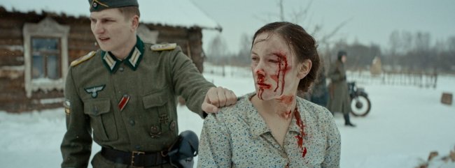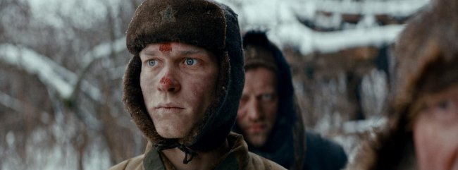 Впрочем, описанное выше относится к кульминационной батальной сцене, которой предшествует довольно затянутая завязка, состоящая из разрозненных и будто бы склеенных друг с другом в случайном порядке диалоговых этюдов. Юра Борисов, существующий в фильме, по сути, в качестве этакой приглашенной звезды, изо всех сил старается сыграть хоть что-то при весьма скупых предлагаемых обстоятельствах. Ему везет хотя бы в том, что у его персонажа есть в этой истории некоторые отличительные черты: замерзший в снегу солдат почти отморозил одну руку и почти потерял голос, так что Борисов всю дорогу дует на ладонь и безнаказанно шепчет – никакого брака по звуку, так надо. А еще то и дело задумчиво смотрит в пустоту, как будто добавляя истории философской глубины, ведь никто не знает, через что прошли герои — одни реагируют беспрестанной болтовней (дед и морячок), а он шепчет и смотрит.