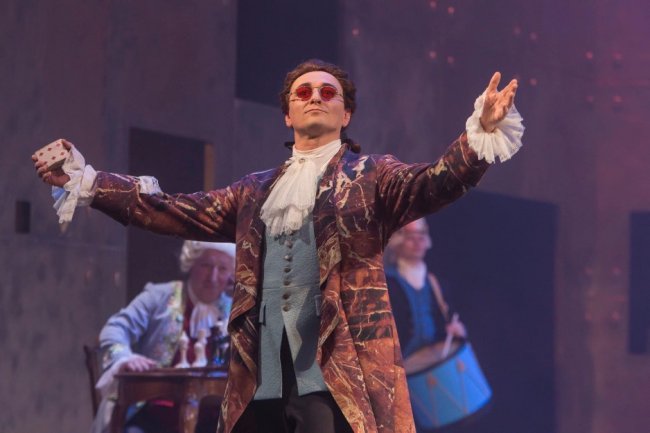 Безруков в роли Джакомо Казановы влетает на сцену в расшитом камзоле и парике, сыплет с идеальным произношением большими цитатами и отдельными словами на итальянском: «Мамма мия, прего, дестино (судьба), скерцо (шутка)». Он улыбается, уверенно обольщает дам на сцене и зрительниц в партере, движется как Фигаро здесь, Фигаро там, даже поет кусочек арии из оперы Моцарта, с которым был дружен Казанова.