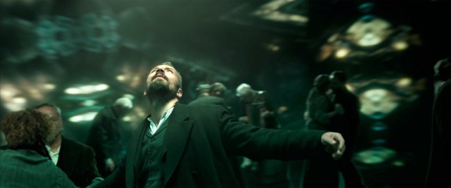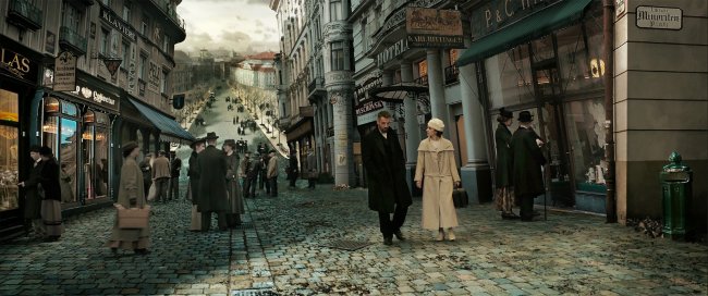 Оно здесь – будто в комиксах – дано нарочито визуально. Улицы Вены 1920-х перепутались и переломались, как в благочестивых рассказах О.Генри, только немножко с другой стороны. В объективе «Хинтерленда» нет классических общих зданий – здесь все нависает над актерами под определенным углом. Особенно над Муратаном Муслу, исполнителем роли Перга, чье изображение на фоне ни в одном из кадров не будет схоже с классическими фотографиями Вены. Его герой – Петер Перг – остается один на один с этой новой Веной, здесь специально будто бы наклоненной. «Хинтерленд» снимался в павильоне на «синем фоне», и только на пост-продашкне дорисовывались фоны, причем в искаженном формате. В кадре почти нет ровных линий и прямых углов, все здания стоят под наклоном, как в отражении кривого зеркала, Рузовицки таким образом отдает дань экспрессионизму, зародившемуся как раз в Австрии и Германии начала XX века, и сам признается, что на том самом «синем фоне» создал цифровую версию «Кабинета доктора Калигари».