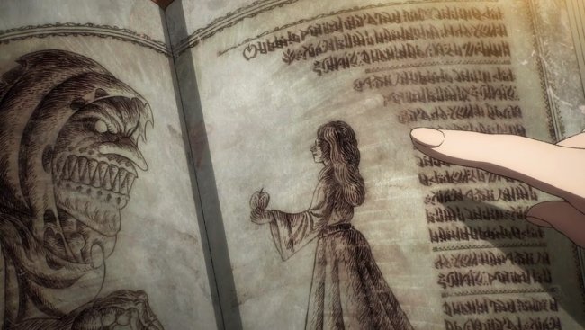 Следом через монтаж памяти — Фрида вместе с маленькой Хисторией читает древнюю сказку-быль о жизни Имир Фриц — рассказывается, как вообще обрела силу титанов молчаливая девушка, которая вылепила из песка новые тела для Зика и Эрена. На книжной иллюстрации она встречает зубастое существо, но время этой (незамысловатой, кажется) загадки еще не пришло.