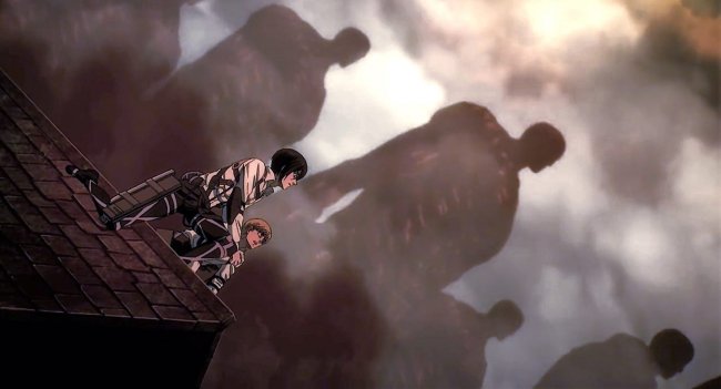 Три стены начинают разрушаться, освобождая 50-метровых титанов. Дружными рядами они отправляются топтать все, что встретится им на пути. Армин Арлерт, еще недавно ликовавший, что Эрен все-таки на их (что бы это теперь ни значило) стороне, начинает подозревать, что количество исполинов слегка превышает необходимое. Уничтожить союзные войска в Марлии можно куда меньшим числом. Голова Эрена, едва коснувшаяся пару серий назад руки Зика, обретает исполинский позвоночник, а сам он превращается в скелет Первородного.