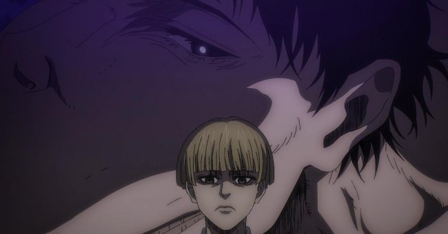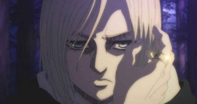 Весь остальной эпизод — разговор у костра, перечень взаимных болей, бед и обид, которые могут помешать успеху предприятия. Мизансцена — блестящая: Ханджи трудится у котелка с ужином, костер чуть отгоняет фиолетовый мрак ночи, эльдийцы и марлийцы расселись с разных флангов. Перебежчики Елена и Оньянкопон, решившие противостоять Марлии по своим причинам, сидят спиной к камере; ближе к жителям Парадиза, чем землякам. «Кадровые» решения — не хуже. Два ключевых приема: а) крупные планы, как в «Мистере Роботе»: лицо расположено не в центре кадра, а в правой или левой трети, иногда — даже в нижнем углу; б) композиция из нескольких фигур и лиц, что подчеркивает существование идеологических лагерей (и напоминает о пропагандистских плакатах или героических профилях правителей). Все это подчеркивает разобщенность не только между марлийцами и эльдийцами, но и внутри их групп, а также персонажей с самими собой.