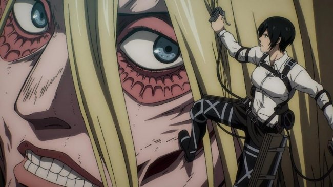 С ровесниками они активно сражались в порту. Микаса включила режим берсерка и безжалостно выкосила пару крыш экс-соратников, пока Флок обвинял всех в предательстве родины. Унаследовавший силу Зубастого титана Фалько игнорирует приказ Пик (Перевозчик) и перевоплощается, чтобы помочь соратникам в безвыходной ситуации. Первое перевоплощение — самое сложное: чаще всего, оно не отпечатывается в памяти и сопровождается буйством.