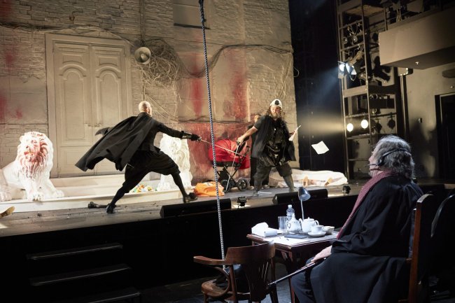 в роли пожилого актера Александра Михайловича (оба не зря получили номинацию на «Золотую маску»). После первых показов зрители гадали, кто играет главную роль в постановке, потому что Евгений Цыганов здесь совершенно неузнаваем и, как все уже отметили, великолепен. Авторитарный Евгений Эдуардович – собирательный персонаж, в нем можно углядеть и Алексея Германа