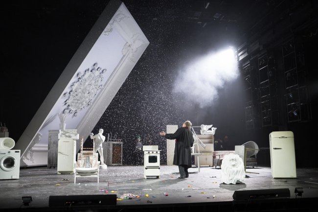 ), и молодые оперные исполнители. Демонстративно презрительно настроенный к происходящему, источающий флер былого величия, режиссер начинает репетицию, в ходе которой убивает из ружья разочаровывающих его актеров и находит им замену – среди былых соратников, когда-то актеров, а нынче вышедших на пенсию работников театра, монтеров, уборщиц и других случайно оказавшихся тут старых знакомых. Прогон спектакля – повод показать театральное закулисье в сатирической манере. Крымов соединяет несоединимое: музыку Моцарта с абсурдным юмором, академический вокал с песнями Валерия Леонтьева, фонограмму с живым пением, невероятные трюки с самыми расхожими театральными штампами. Здесь есть настоящая земля и настоящий снег, воздушные шары и модель дымящегося завода, советская мебель и заряженное ружье, гигантская зебра и хрустальная люстра, а также импровизированное кладбище и детская коляска, из которой своими ногами выходит мальчик. Постоянный сценограф Крымова, обладательница нескольких «Золотых масок» Мария Трегубова придумала впечатляющие декорациии и эксцентричные костюмы, в которых также соединяются утрированные наши представления о классическом театре, стереотипные образы изношенных пенсионеров союзного значения и разные неожиданные идеи.