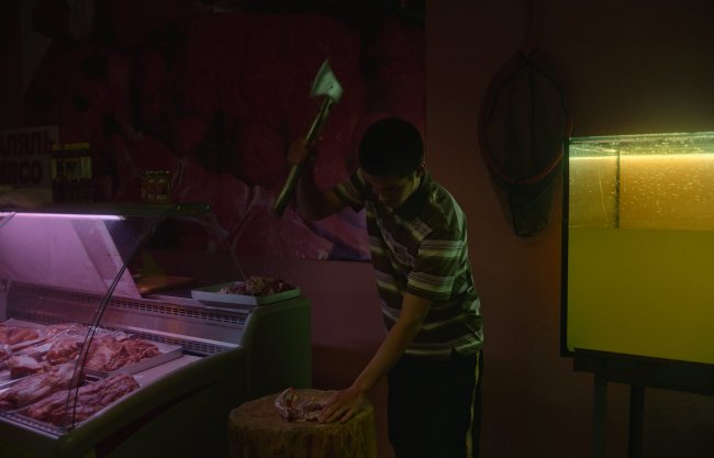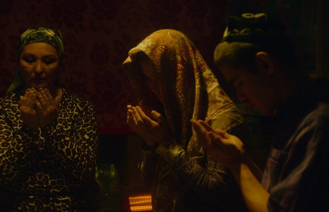 ), дочь Рамазана, и Бекзод (Толибжон Сулейманов), сын Санджара. Завораживающая хореография рук — молитвенные жесты перемежаются тем, как новобрачные по очереди подносят друг другу воду и сладость, — прекращается вместе с ритуалом. Камера отъезжает, демонстрируя бутылку «Святого источника» и декорации таинства — кладовую магазина. Мухаббат пора возвращаться за прилавок. Неоновая вывеска «Продукты 24» сзывает окрестных страждущих: вот один уже заждался свою чекушку.