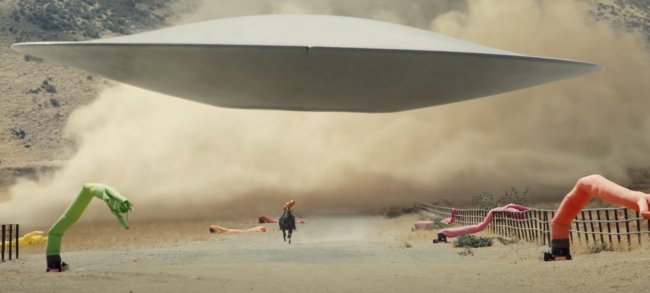Сцена, когда Юпитер призывает пришельца при помощи лошади в стеклянном загоне, может напомнить жертвоприношение в начале «Кинг-Конга» (1933). И так же, как сотню лет назад, рискованная сделка с неизведанным заключается ради потехи публики, чтобы выставить чудо «всем напоказ». Посмотреть, конечно, есть на что: инопланетянин с иных ракурсов похож на ковбойскую шляпу, напоминая о циничности покорителей Америки, а с других — на ангела Сахакиила из «Евангелиона» (1995-1996). Ничего удивительного: Джордан Пил — ценитель аниме-классики, и в «Нет» впихнул даже разворот на мотоцикле, как в культовом «Акире» (1988). Оба примера — про попытки лечить душевные раны иллюзией величия, стремление к нечеловеческому могуществу и объявление войны мирозданию.