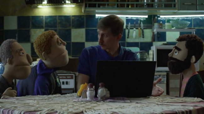 В общем, все как у людей. Только Никита, Гоша и Ефим Маратович — живые куклы, которые сталкиваются в довольно будничных ситуациях с алкозависимыми соседями (Юрий Быков