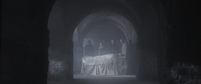 Напоминая работы голландских живописцев, «Призрачно-белый» требует внимательного рассматривания. Из красок здесь только охра – цвет земли, прелой листвы, болотной воды. Остальные оттенки предельно холодны: в разреженном воздухе много тумана и рассеянного света. Вымороженность чувств и сознания подчеркивается в каждом кадре. Как будто все, что происходит – лишь сон. В стенах монастыря все еще служат мессу, в то время, как его гулкие сводчатые подвалы служат и казармами для солдат, где те бесчинствуют и пьют, и тюрьмой для тех, кому уготована смерть. Марис принимает причастие и вдохновенно уподобляет новую работу какой-то особой религиозной миссии.