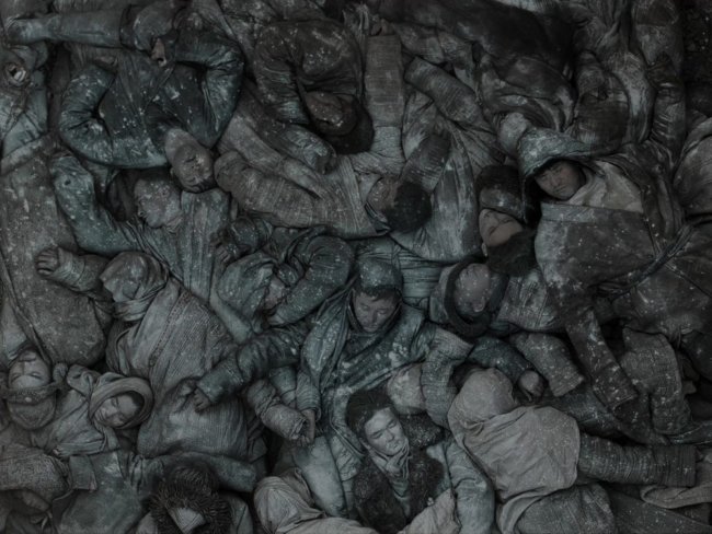 ), который каждый день свозит новые трупы в общую могилу — зияющую рану посреди степи. С высоты птичьего полета обилие тел из-за слоя хлорки начинает походить на песчинки в безжалостных часах, которые то ли отсчитывают начало новой эпохи, то ли сулят всему сущему неизбежный финал.