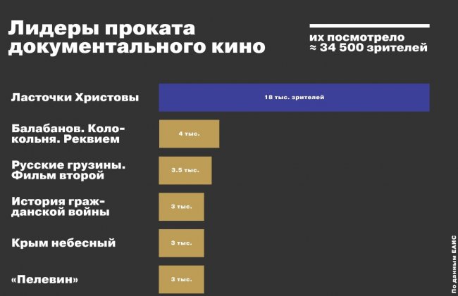 Еще, как мы знаем, из кинотеатров ушел Голливуд, и сразу освободилось куча «места» для проката отечественных лент, в том числе и неигровых. Тут выяснилось, что документалистам предложить кинотеатрам практически нечего, а кому есть – тем могут выдать лишь отрицательное одобрение. И это при том, что Минкульт выдал за 2021-й и 2022-й свыше 400 прокатных удостоверений неигровым картинам. Из них на экраны вышло 19, которые в общей сложности посмотрели 50 тысяч человек. Лидером проката стала картина «Ласточки Христовы», которая привлекла в кинотеатры около 18 тысяч человек и подтвердила тренд на интерес к духовному документальному кино. Среди фильмов, которые посмотрели более трех тысяч зрителей (по данным ЕАИС), — «Русские грузины. Фильм второй», «Крым небесный», «Балабанов. Колокольня. Реквием», «Пелевин» и «История гражданской войны».