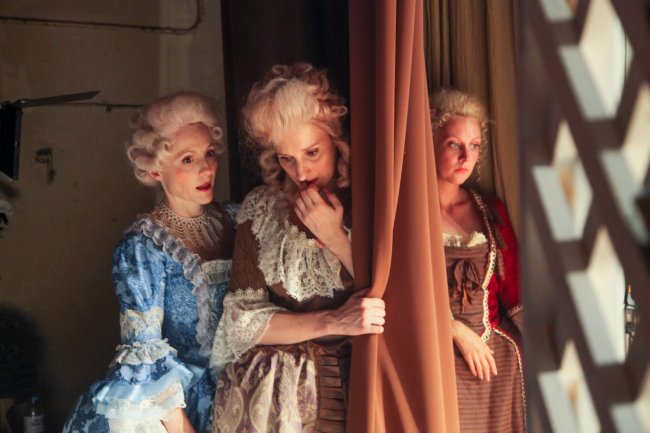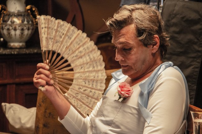 ) и танцует в женском платье Качалов — первая живая встреча Раневской с ним поставлена в виде эксцентричного перформанса, надо сказать, виртуозно исполненного в кои-то веки игривым, улыбчивым и словно скинувшим с десяток лет Домогаровым, порхающим в пачке, изображая великого лицедея.