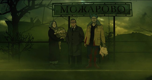 Не обходится в «Красном составе» и без сложной анимационной техники – ротоскопирования, которая была выбрана для эпизода «Можарово» по одноименному рассказу Дмитрия Быкова. Канадские актеры, превращенные в анимированных персонажей этого без преувеличения фильма режиссера Мэттью Лайона, играют москвичей из альтернативного антиутопического будущего. Где столица, населенная сильными мира сего, отделена от зараженного неведомой хворью Подмосковья стеной. С внешним миром — читай, Россией — ее соединяет лишь железная дорога, по которой ходит недавно запущенный поезд с гуманитарной помощью. В очередной рейс с компанией богачей, артистов и съемочной группы популярного новостного шоу отправляется молодой журналист Максим. Он надеется узнать правду – и она полностью изменит его жизнь: прежде всего — лишит каких-либо романтических иллюзий в отношении как мира вокруг, так и выбранной профессии. Финал выходит циничным и реалистичным, хотя все остальное смотрится, даром что сыграно реальными людьми, максимально фантастическим. Не будь это анимацией, вышло бы банально, но ротоскопия нагоняет необходимой жути – они и настоящие, и в то же время нет. Что до сюжета, то он по-хорошему вкрадчив, исчерпывающе лаконичен и прост для трактовки. Законченная страшилка, которая, как и положено добротной антиутопии, напрямую связана с действительностью, в меру поучая и предупреждая.