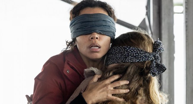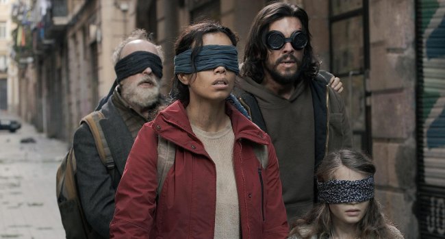 Зрение из важнейшего инструмента познания мира превратилось во врага. Поэтому героине Буллок приходилось искать безопасное место, до которого таинственные чудовища до сих пор не добрались, наощупь – двое суток вслепую сплавляться по реке с двумя маленькими детьми и канарейками-индикаторами, которые при появлении неизведанного начинают кричать и бить крыльями. Именно птицы в коробке и подарили название оригинальному роману американского фантаста Джоша Малермана, перенесенному на экран Сюзанной Бир («Ночной администратор») и сценаристом Эриком Хайсессером