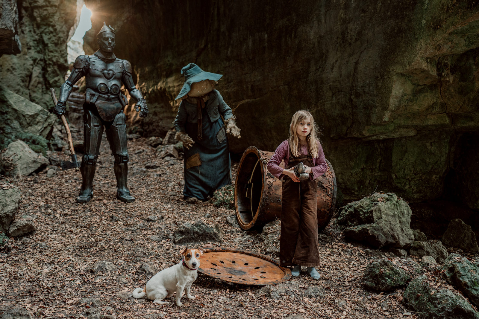 . А вот узнать, кто играет Страшилу, невозможно уже на съемочной площадке, потому что костюм у него полностью скрывает не только тело, но и лицо. «Баум, а вслед за ним и Волков, придумали Страшилу как персонажа с нарисованным лицом, поэтому и у нас лицо Страшилы будет сделано в 2D-анимации, над его мимикой и образом мы как раз сейчас работаем, пытаемся понять, как он улыбается, как смотрит, как у него перемещаются нарисованные брови и так далее», – отмечает Горохов. Гримеры шутят, что на натурных сценах, когда в кадре только Элли, Тотошка, Страшила, Лев и Дровосек, самый сложный грим – у собак. Больший пласт работы у грима уже в подмосковном павильоне, где снимают сцены с участием ведьм Бастинды и Гингемы. Они, кстати, полностью лысые, более того, у них нет даже бровей и ресниц. У Бастинды, которую играет Светлана Ходченкова