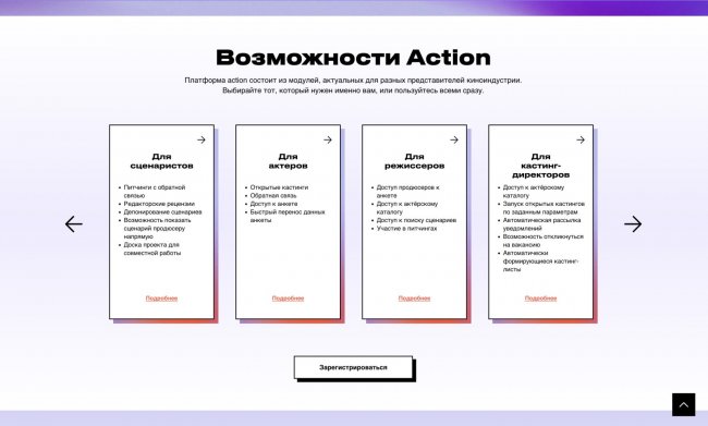 Мы разрабатываем платформу, она находится на action.online. Первый модуль – это система для тех, кто ищет работу в сфере кинопроизводства – все профессии. Этот модуль бесплатный, он уже сейчас запущен и работает. Ты можешь зайти туда и создать свой профиль.