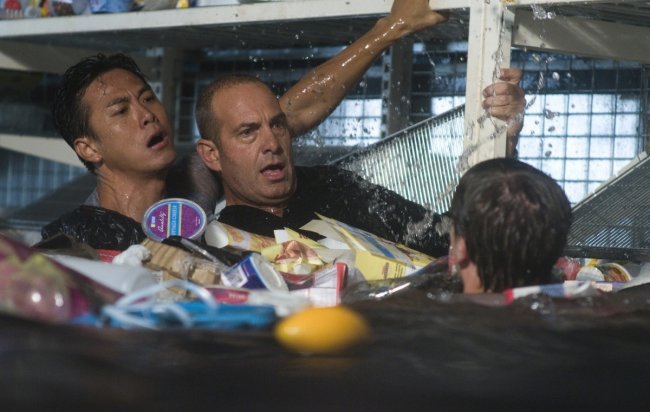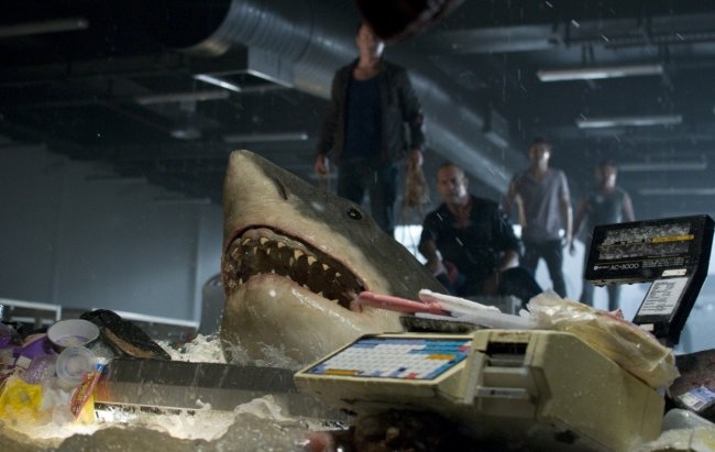 , действие «Цунами» разворачивается на территории супермаркета. Только вместо чудовищ и зомби героям угрожают вода, затопившая половину здания в результате гигантской волны, и зубастые хищники, имя которым белые акулы. Хорошо хоть среди оставшихся в живых есть бывший спасатель, переживающий гибель своего друга и коллеги, полицейский, пострадавший во время цунами, грабитель и бывшая девушка спасателя, которая тоже не лыком шита. Персонажей, разумеется, в фильме побольше, но именно этим четверым да парню, спасшемуся от потопа в подземном гараже, предстоит решить судьбу всех, кто спасся и от постоянно пребывающей воды, и от голодных акул.