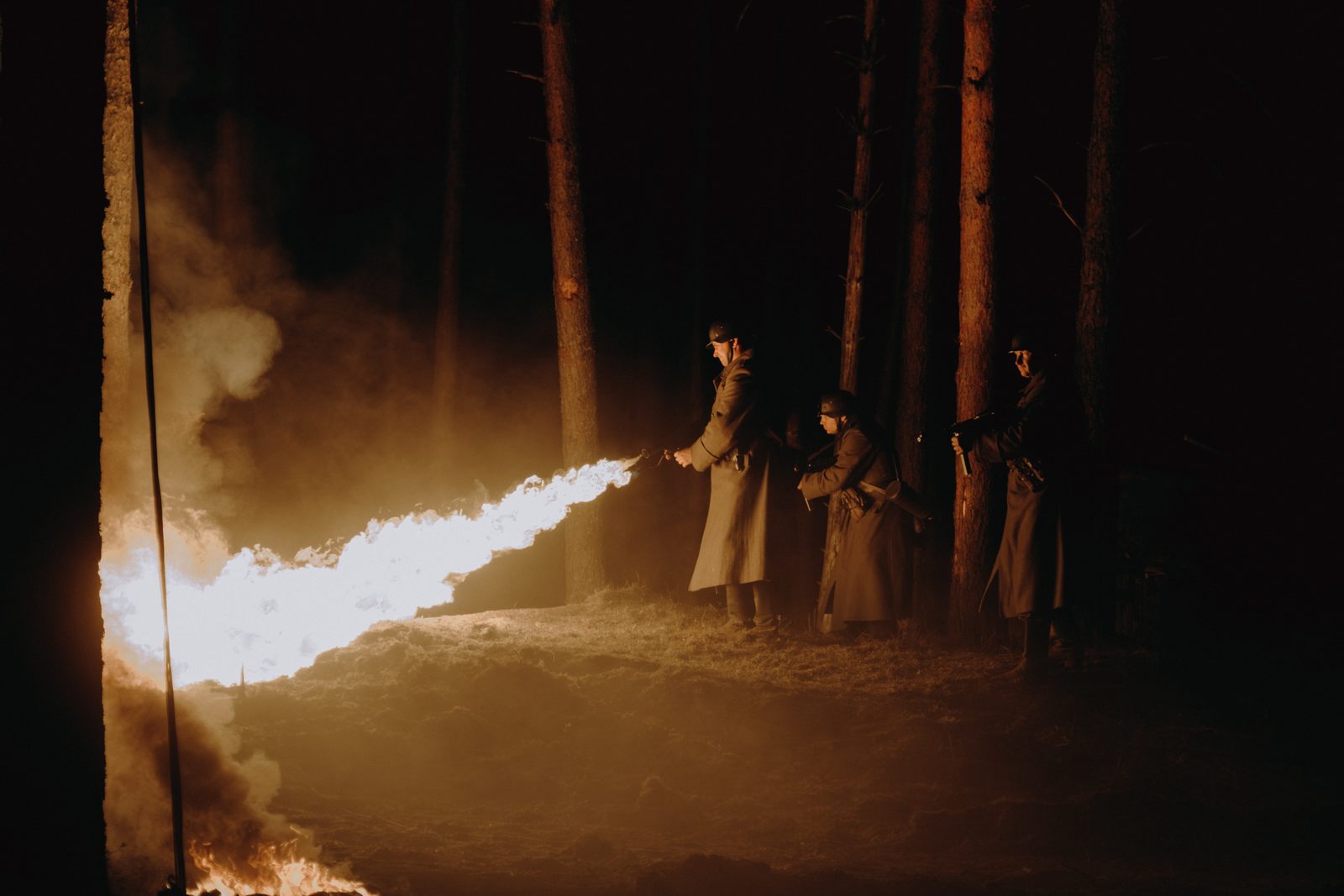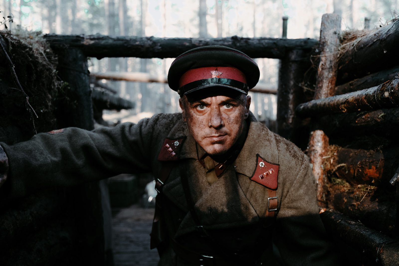 С ровной асфальтированной трассы, ведущей из Пскова в область, в чащу уходит чем дальше, тем более сужающаяся тропинка. Впрочем, лес тут не выглядит густым – чуть позже художница Анна Стрельникова поэтично назовет его «прозрачным». Тонкие сосны растут будто бы ровными рядами, между которыми нет ни кустарников, никаких прочих, закрывающих обзор, препятствий. Вместо указателей – сваленные у одного из стволов черные автомобильные шины. Сразу понятно, что рядом снимают, скорее всего, кино о вoйне, а покрышки жгут, чтобы получить дым танкового сражения. Сами танки, как выяснится, уже отсняли, их пригоняли для эпичной сцены из Санкт-Петербурга, из частной коллекции «Ретроавтопрокат». Впрочем, и без техники тут есть, на что посмотреть – выбранный для натурных съемок, которых в «Блиндаже» большинство, лес видел многое, ведь когда-то здесь шли настоящие бои, следы которых все еще виднеются в попадающихся то тут, то там полузасыпанных ямах причудливых форм – настоящих окопах. Первым на поляне, где выстроились вагончики и уже суетятся техники, появляется Даниэль Литтау