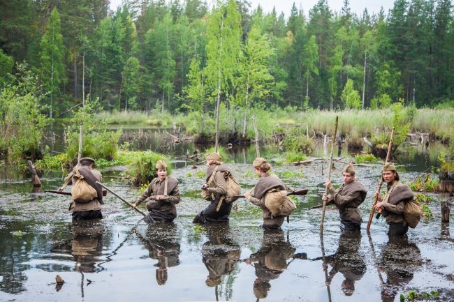 ), — но среди болот старшина и девушки натыкаются не на пару, а на целых 16 вооруженных до зубов врагов.