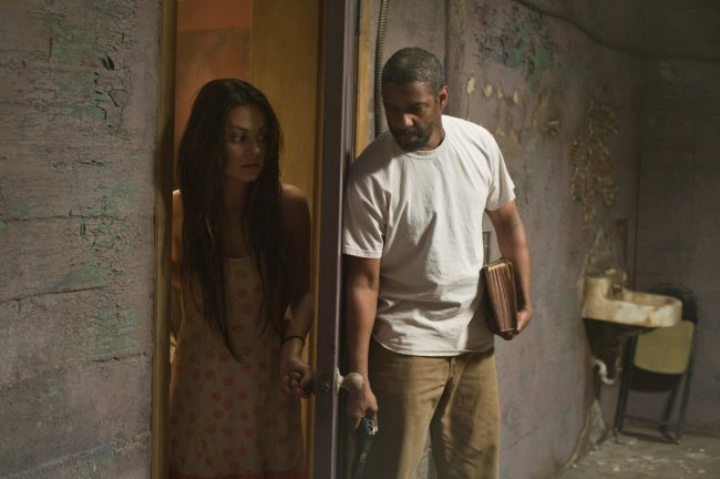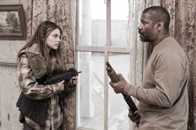Почему я говорю «за попытку». Дело в том, что идею они подали, как я уже сказал, оригинальную и интересную, но вот развить её до финальной точки не смогли: отделались парой повседневных фраз. Зато они отлично развернулись в создании атмосферы, которая, к слову, вышла у них довольно-таки самобытной. Жаль только, что эта самая атмосфера, все эти декорации и прочее выплыли на первый план. Конечно, в таком мрачном мире будущего, каким его представляют режиссеры, основным аргументом в любом споре является насилие, а главной задачей кинематографа, рассказывающего о таком будущем, — показать это самое насилие. И тут вновь «Книга Илая» преподносит сюрприз. Братья Хьюз смогли поймать ту тонкую, вечно ускользающую волну сочетания action-сцен с моментами, над которыми стоит подумать: секунду назад Дензел Вашингтон невероятно сурово разделался с бандой головорезов в баре, как он уже не менее сурово зачитывает свою проповедь юной соблазнительнице в исполнении Милы Кунис.