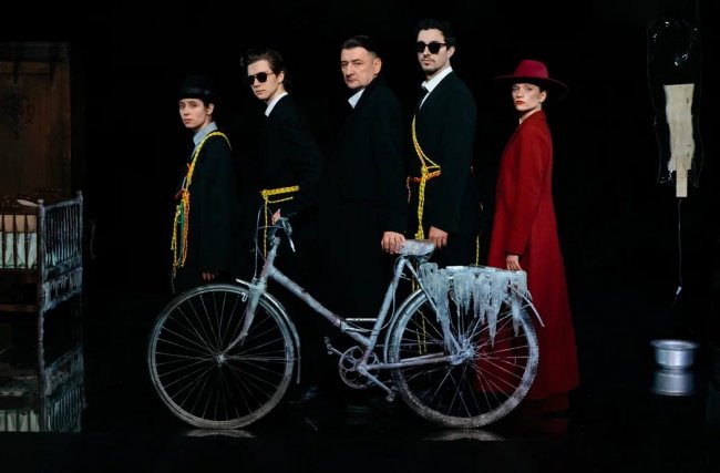 Обилие художественных образов и впечатляющая работа художницы-сценографа Натали-Кейт Пангилилан создает пространство для работы воображения. Детская колыбель становится олицетворением надежд, внутри нее калачиком сворачивается героиня, пытаясь сохранить будущего ребенка и мечту о лучшей жизни. А вот Повитуха (Алина Исхакова), главный персонаж родовых обрядов, выносит на сцену микрофон, чтобы учинить беременной настоящий публичный допрос с пристрастием. Эта сцена и последующий суд — самый напряженный момент спектакля, предваряющий три его финала. Мертвая девушка из рассказа бабушки одета по моде 20-х годов – в черном платье она крутит на столе хула-хупы, символизирующие крайнюю степень напряжения, предсмертную агонию. Она ездит на велосипеде с пропавшим братом (Тимофей Бенедиктов), и оба они существуют на сцене наравне с живыми, как проекции внутренних мучений и воспоминаний людей трех поколений, живущих в страхе издать лишний шум. Старейшины и охранники выглядят как тарантиновские «бешеные псы» и носят карабины и веревки, которыми пристегивают и обрекают на пытку нарушителей закона, подвергающих опасности общество. С появлением этих персонажей «Лавина» входит в зону актуальной драмы, показывая, как власть во все времена использует страх людей как самый выгодный механизм контроля и всеобщего повиновения. Меж тем, об этом написано даже в программке для зрителей, учеными доказано: громкий голос и даже выстрел из ружья не способен вызвать сход снежной лавины.