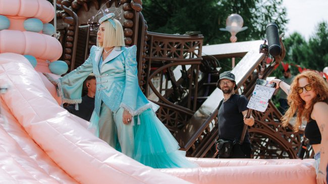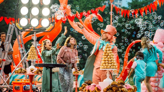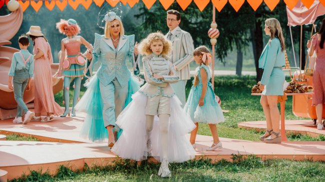 В парке имени Ю. М. Лужкова, где и происходят съемки, нетрудно заметить эти толпы детей в невероятно стильных вещах. Два главных цвета праздника: розовый и мятный — единственное, что повторяется в образах маленьких актеров. В остальном у каждого специально подобранный праздничный костюм со множеством аксессуаров: рюшей, бантиков и так далее. С таким вниманием гостей Сони одевала Наталья Каневская: «В этом эпизоде, помимо главных героев, много детей из массовки. Не хотелось, чтобы этот праздник был похож на выпускной в детском саду. В кадре будут льняные платья, тюлевые аксессуары, кейпы, даже соломенные шляпы». По словам художника по костюмам, иногда вдохновение для создания одежды давала обработка нейросети: «Чтобы почерпнуть какие-то идеи, готовые эскизы мы прогнали через искусственный интеллект. Он, к примеру, не знает, что у человека на ходулях есть ноги, поэтому ИИ предлагает сделать штаны, которые частями надуваются и при этом как бы «перерезаны». До такого интересного решения человек иногда додуматься не может».
