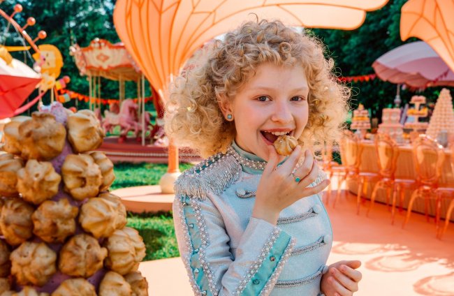 Как раз со дня рождения внучки Риммы и начинается новая история. Праздник поражает масштабом: зритель увидит шоколадную Эйфелеву башню, карусели, и дорожки, напоминающие подиумы. Поскольку Римма — хозяйка кондитерской фабрики, сладостей для внучки не жалеет. Длинные столы заставлены сладкими угощениями. Вокруг шоколадные фонтаны, горы эклеров и круассанов, торты и другие пирожные, количество которых нельзя сосчитать. Причем, все перечисленные сладости настоящие. Они выпекались специально для съемок. Светлана Никитина, художник-постановщик, рассказывает детали работы над праздником: «Объемы огромные, так как помимо того, что находится в кадре, у нас обязательно должен быть запас реквизита. Во время съемок часто что-то падает и портится. В наших условиях самым подходящим и стойким видом сладкого оказалось безе».