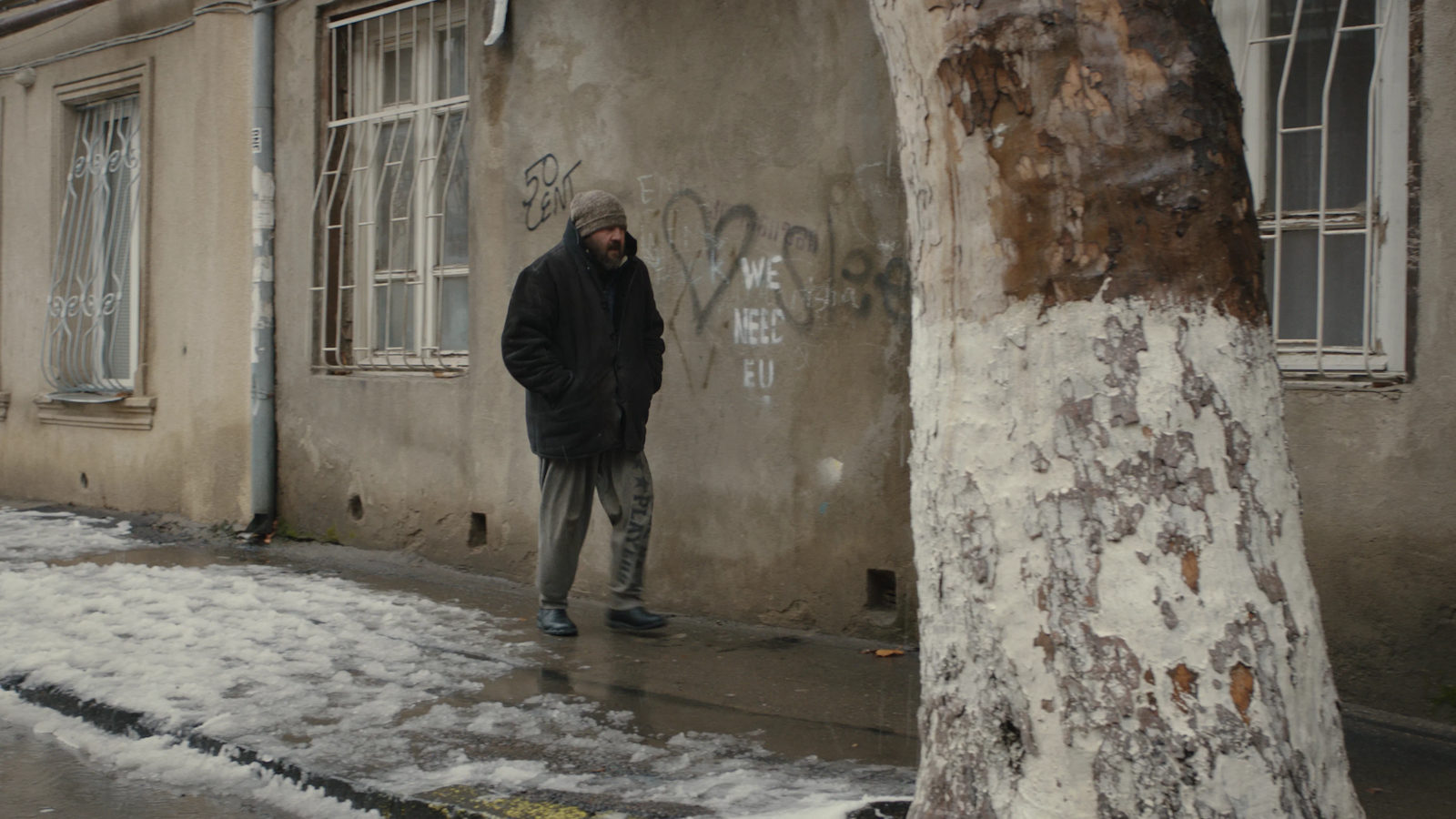 ), в котором небоскребы-стекляшки нового Тбилиси возвышаются над старыми двориками и неубранными террасами. Кто-то мчит по делам на «Мерседесе», другие, в их числе и Леван, ногами месят снежную хлябь, перебиваются случайными подачками и мелкими кражами. То стибрят покрышки, то продуктовый обнесут, распихав по карманам рыбные консервы. Леван, может, и полощется где-то на дне городской жизни, но не лишен внутреннего стержня: попрошайничает молодо и нагло, может даже у префекта денег стрельнуть. Обещает разблокировать в скайпе своего болтливого родственника, если тот заплатит 500 лари — бесплатно выслушивать всю эту чушь нет ни сил, ни желания. Циничность бродяги слетает с персонажа редко, но неизменно к месту: «Снег в моем дворе» изобилует трогательными сценами, в которых герой заботится о своих собачках или увлеченно собирает с детьми конструктор. И великодушно прощает солдата-срочника, решившего обобрать гранатовое дерево в его дворе — отложив нож, предлагает поделить добытое пополам, да и разойтись с миром.