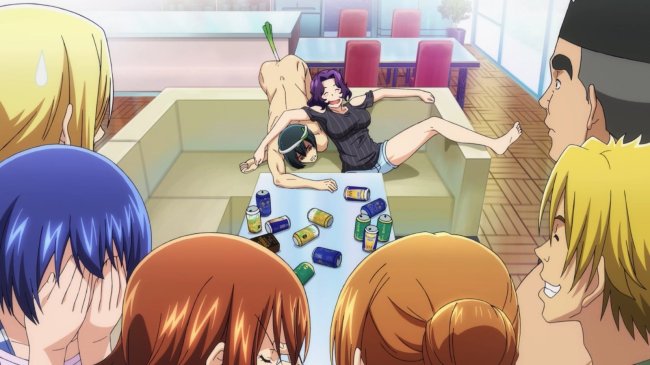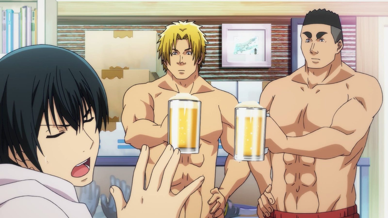 Хотя формально «Гранд Блю» можно отнести к категории тайтлов о хобби или учебе (Китахара с дружками сдает как минимум экзамен по немецкому!), на деле тут правит бал концентрированное веселье, возможное только в безответственную пору студенчества. Иори и его университетский друг Имамура переодеваются парой ради конкурса красоты на местном фестивале, а потом напиваются вдрызг, отмечая победу; рослые дайверы Токита и Котобуки так и норовят подсунуть новичкам виски с водкой под видом улуна; двоюродные сестры Китахары посмеиваются над его безуспешными попытками поменьше пить, а потом наблюдают, как братец в тестостероновом порыве сбрасывает плавки и хватается за кегу.