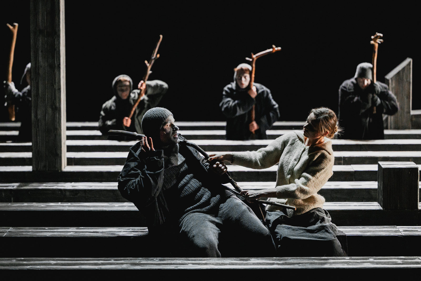 заставляют актеров физически преодолевать расстояния внутри давящей, узкой конструкции. Сценография Анастасии Бугаевой многозадачна и внешне минималистична: конструкция изображает в разных ситуациях хоть деревню, где останавливается взвод, хоть окопы. Это заставляет вспомнить другой спектакль, идущий на этой же малой сцене, — тоже весьма сумрачный «Макбет» Елизаветы Бондарь, где из текста Шекспира была вытащена та же тема травмы и ужаса войны.