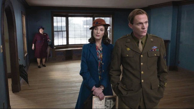 ). Вот уже меняется эпоха, и в знакомых декорациях разворачивается веселая жизнь изобретателя раскладного кресла с энергичной красоткой-женой. Вот капиталистическая беззаботность сменяется мраком посттравматического расстройства, с которым возвращается после войны Эл Янг (Пол Беттани