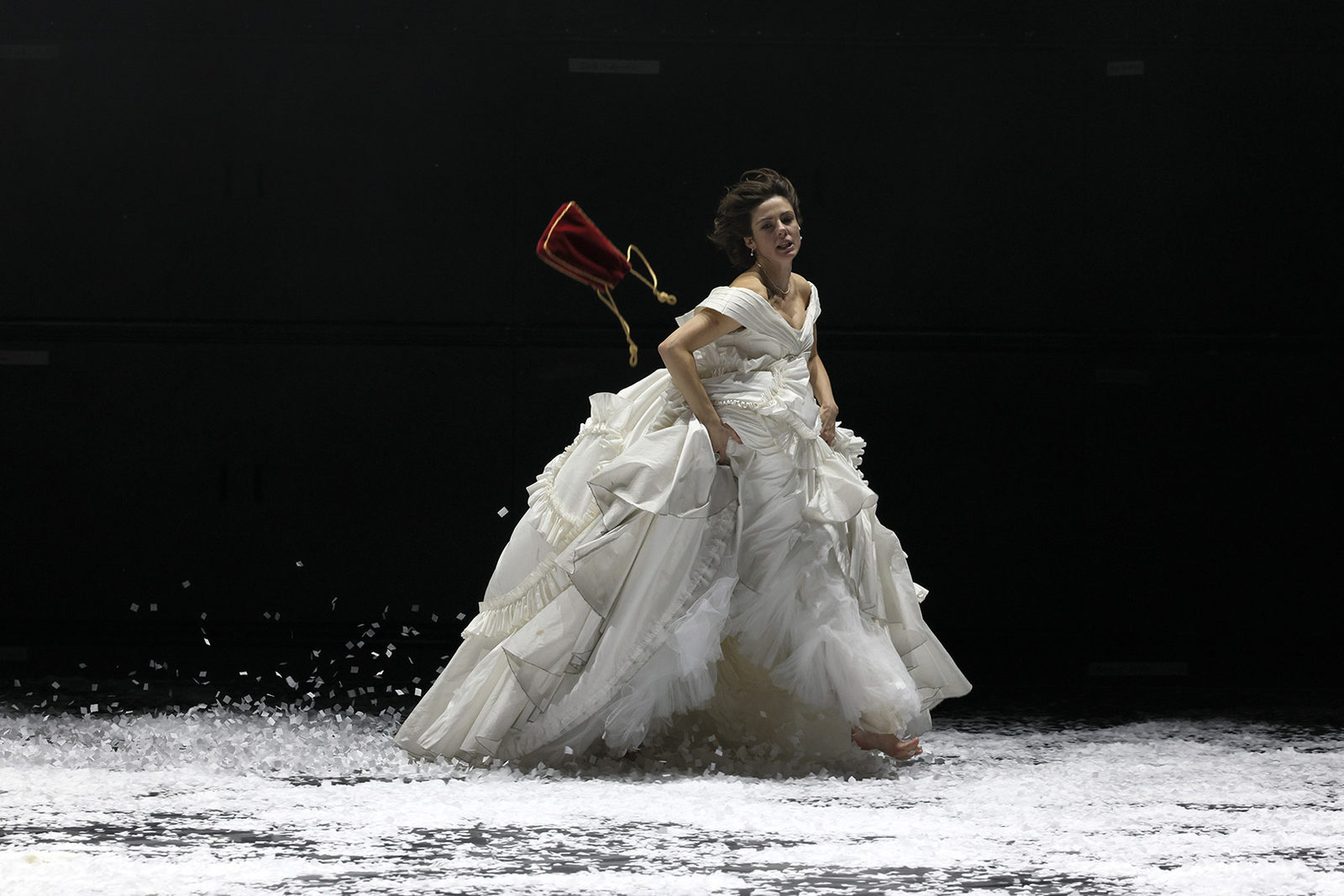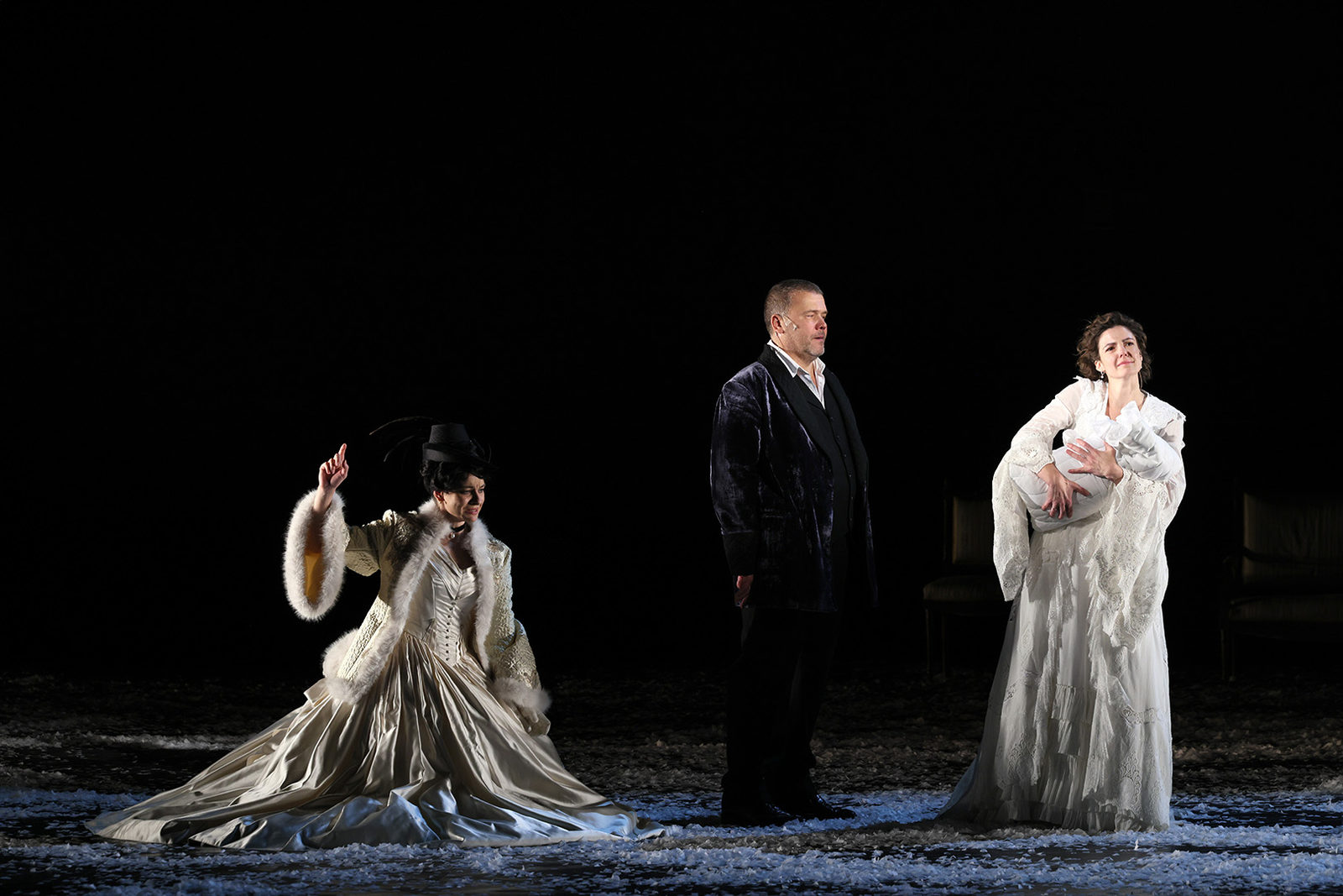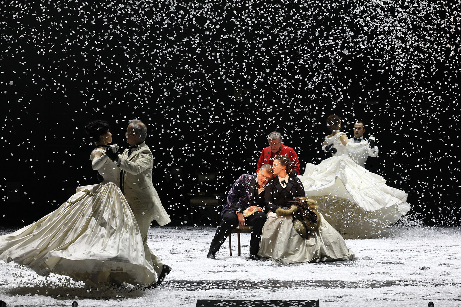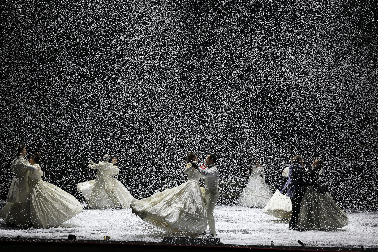 Холодное безразличие бытия подчеркивается снегом, который идет с неба беспрестанно. Легкие бумажные хлопья медленно и красиво падают вниз, но, шурша, взметаются при малейшем движении — так же внезапно и стремительно вздымаются человеческие страсти. Воздушные потоки превращают снегопад в настоящую вьюгу, становясь зримым воплощением рока. На балу в Москве, где Анна впервые появляется в черном, звучит роковой вальс. Чувственная, душераздирающая музыка Евгении Терехиной обнажает неотвратимость трагедии. Пары кружатся в вальсе. Черное на белом, белое на черном. Третий цвет спектакля — красный (и чуть-чуть нейтрального синего) — тоже оттенок трагедии, несчастливой любви, что была так сильна, что разрушила жизни людей, ничего от них не оставила. Чем ближе к развязке, тем яростнее метель. В этой метели Анна и растворится, чтобы исчезнуть навсегда.