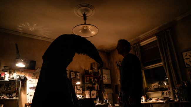 После внезапной смерти жены безутешный художник (Камбербэтч) остаётся один с двумя маленькими сыновьями. Горе поглощает вдовца, он оглушен и подавлен, не хочет общаться с родными и друзьями, не может спать, но для детей «всё должно быть как обычно». Мужчина пытается быть им опорой, заглушая собственную боль, но почти сразу в их доме поселяется тревога: черные птицы заглядывают в окна, а затем появляется незваный гость – сутулый и по-босховски странный полуворон-получеловек, материализовавшийся с мрачных страниц графического романа, над которым работает герой фильма. Сначала это чудовище кажется порождением ночных кошмаров, но вскоре оно начинает преследовать мужчину и среди бела дня, нашептывая ему леденящие душу слова: «Её нет, но я здесь» и почему-то «Я дам тебе пищу для размышлений» (голос Дэвида Тьюлиса
