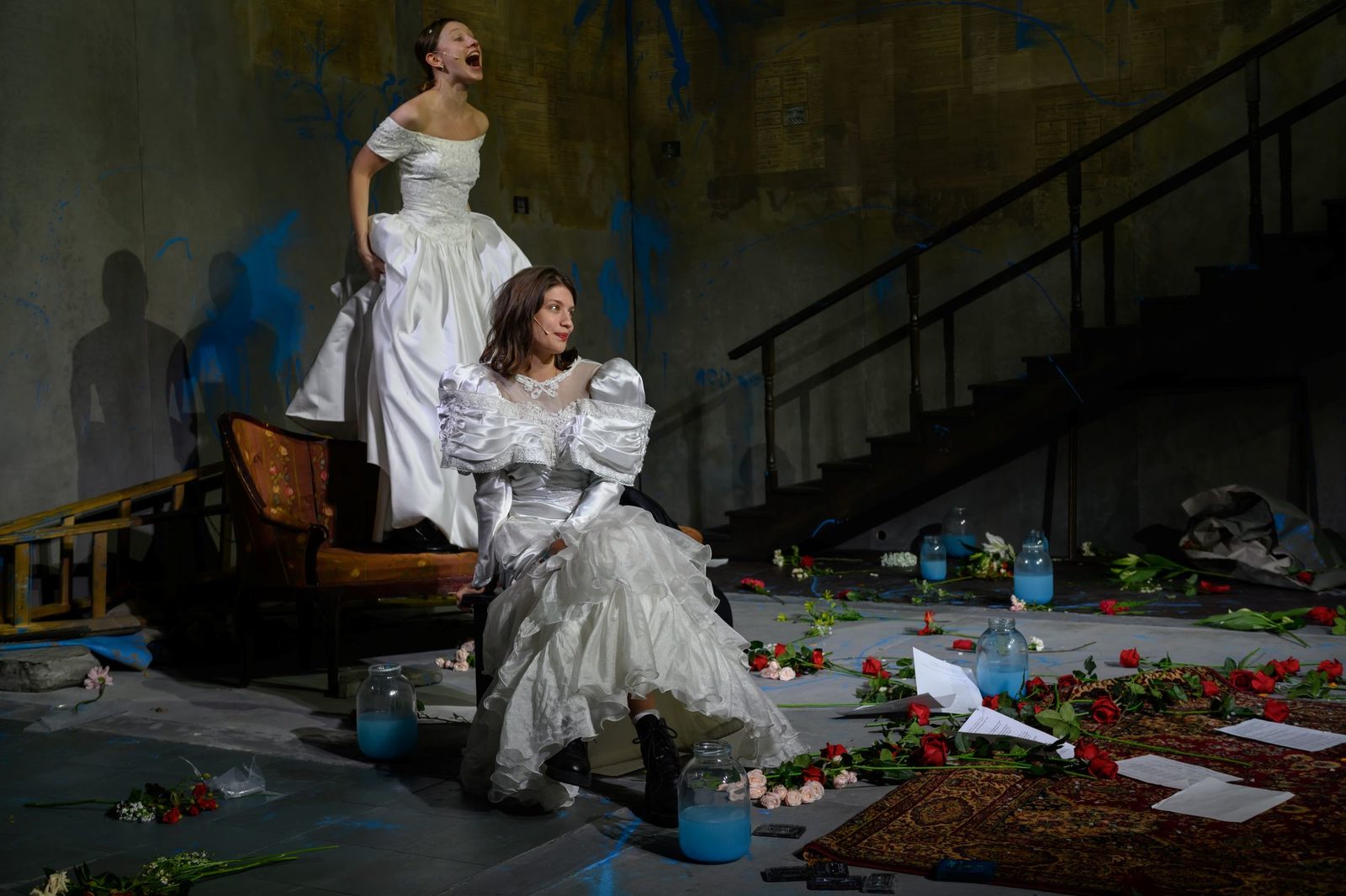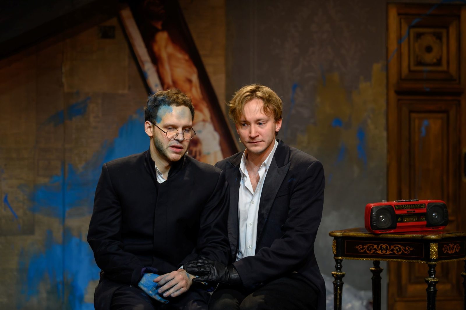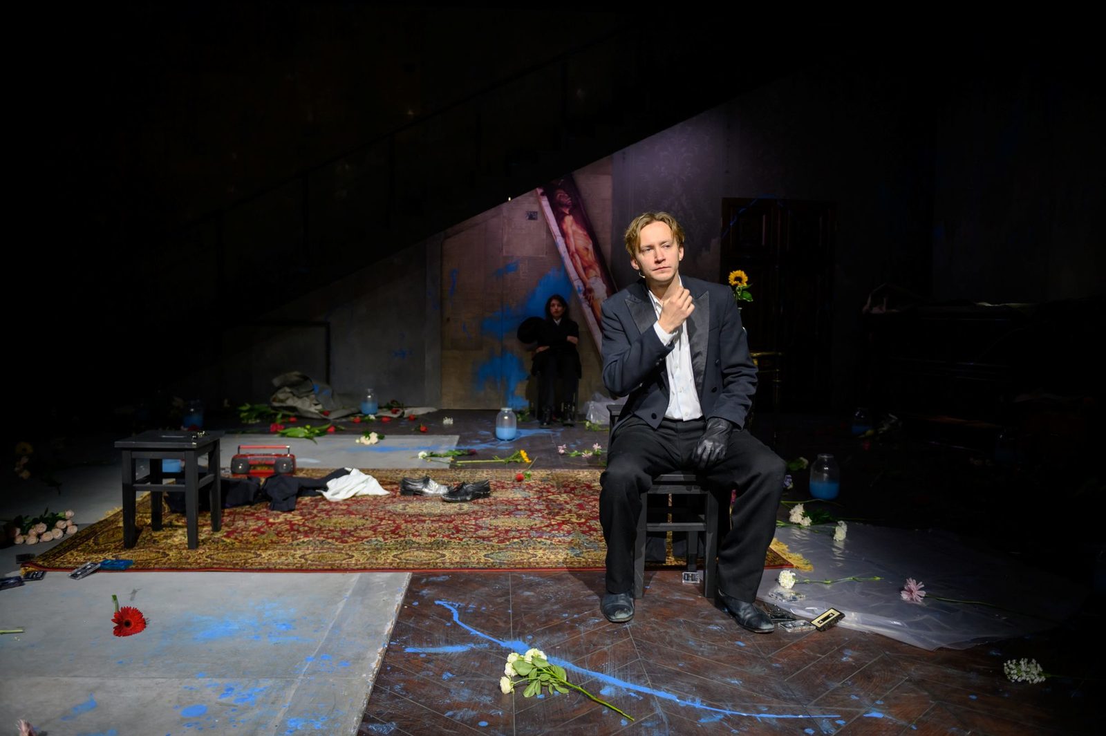 Зрители, входящие в зал, видят пространство, на котором трагедия уже свершилась. Четверо героев – Мышкин, Рогожин, Настасья Филипповна и Аглая – молчаливы, морально и физически истощены, неподвижно наблюдают со сцены, как заполняются ряды. Вокруг них – вылитое место преступления: мусор, разбросанные цветы, банки с голубой жидкостью. Стены тоже вымазаны голубой, липкой и тягучей краской. В ней же испачкан огромный тесак в руках Рогожина (Данил Стеклов